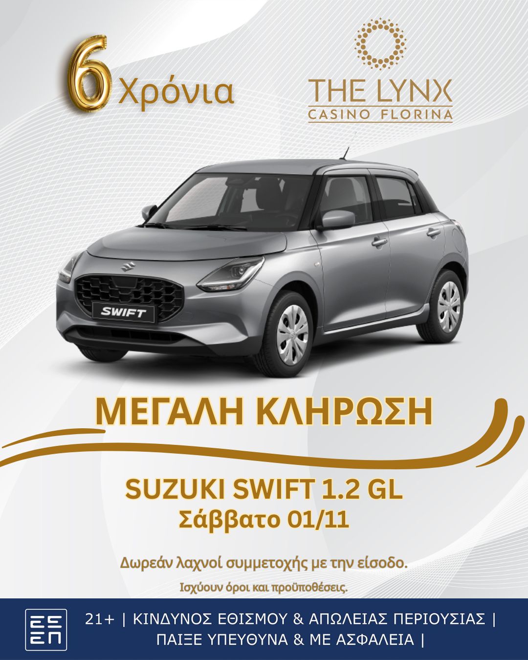 Το THE LYNX CASINO FLORINA αποτελεί τον απόλυτο προορισμό διασκέδασης και κάθε μήνα θα έχετε τη δυνατότητα να συμμετάσχετε στις πιο απίθανες κληρώσεις και να διεκδικήσετε μετρητά & πλούσια δώρα! Μείνετε συντονισμένοι για το πρόγραμμα των επόμενων μηνών και….δεν θα χάσετε!